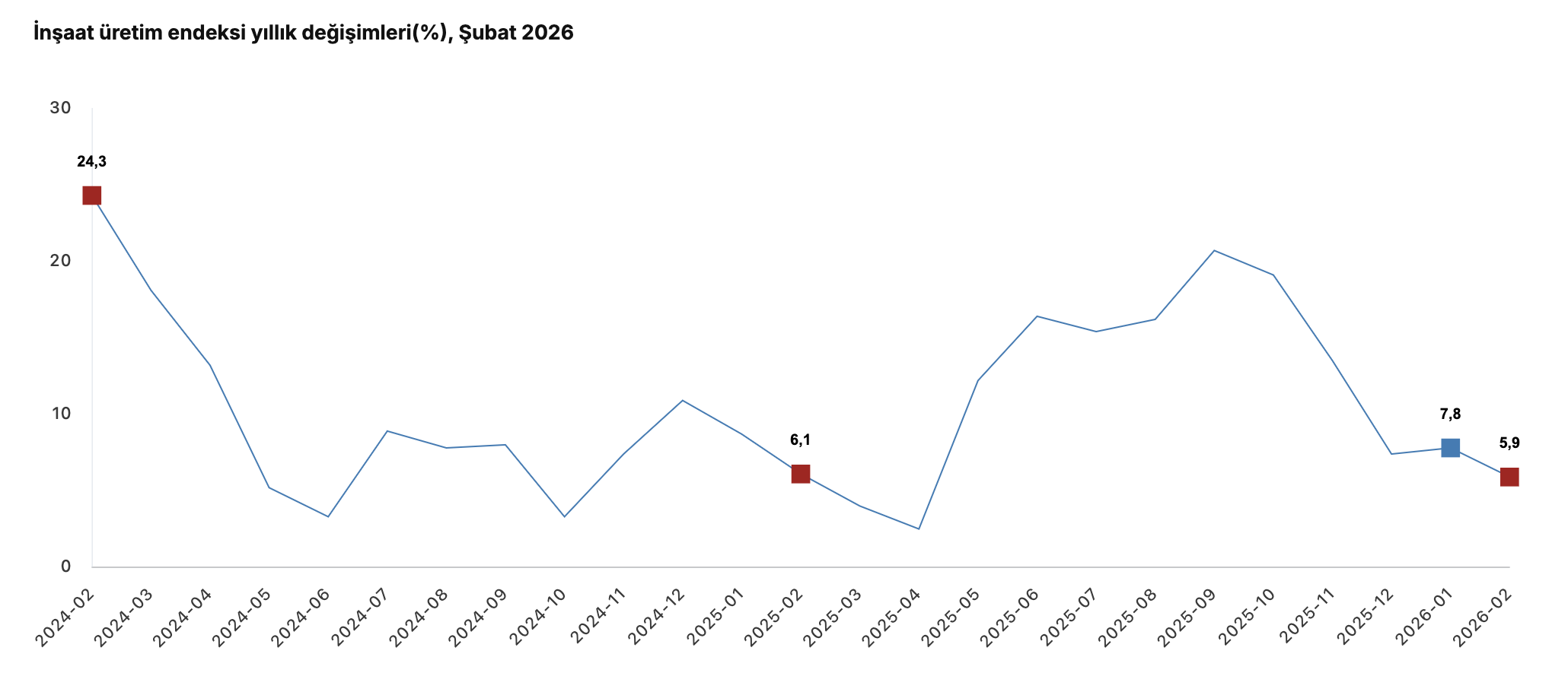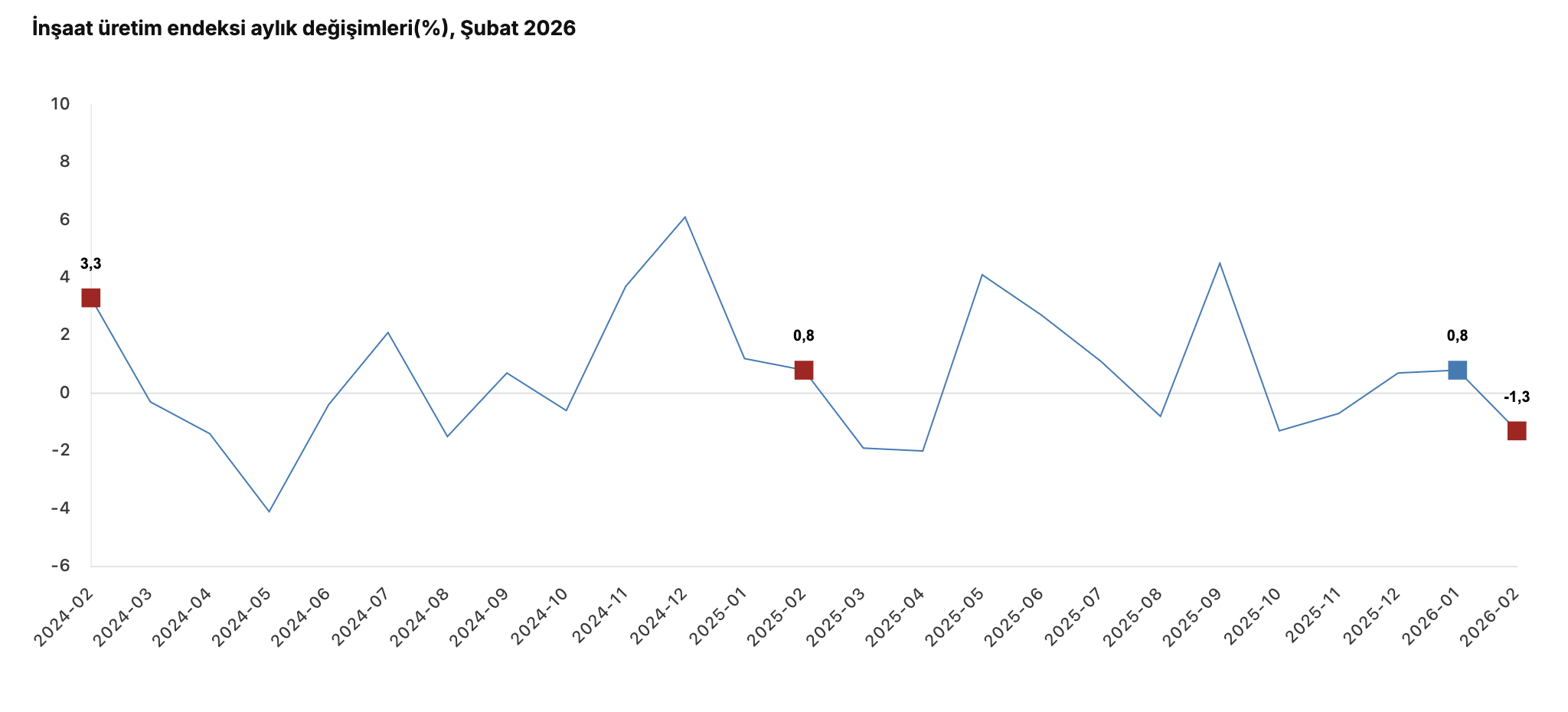 İnşaatın alt sektörleri aylık bazda incelendiğinde ise; 2026 yılı Şubat ayında bina inşaatı sektörü endeksi bir önceki aya göre yüzde 2,5 azaldı.